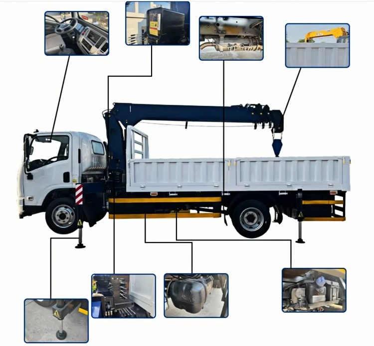 A transport truck integrating a truck-mounted crane with its chassis.It consists of components such as a lifting arm, a turntable, a frame, and outriggers.The mechanical movements of the truck-mounted crane are realized through the actions of mechanisms including luffing, telescoping, slewing, andhoisting.Lifting operations are achieved by combining different movements.